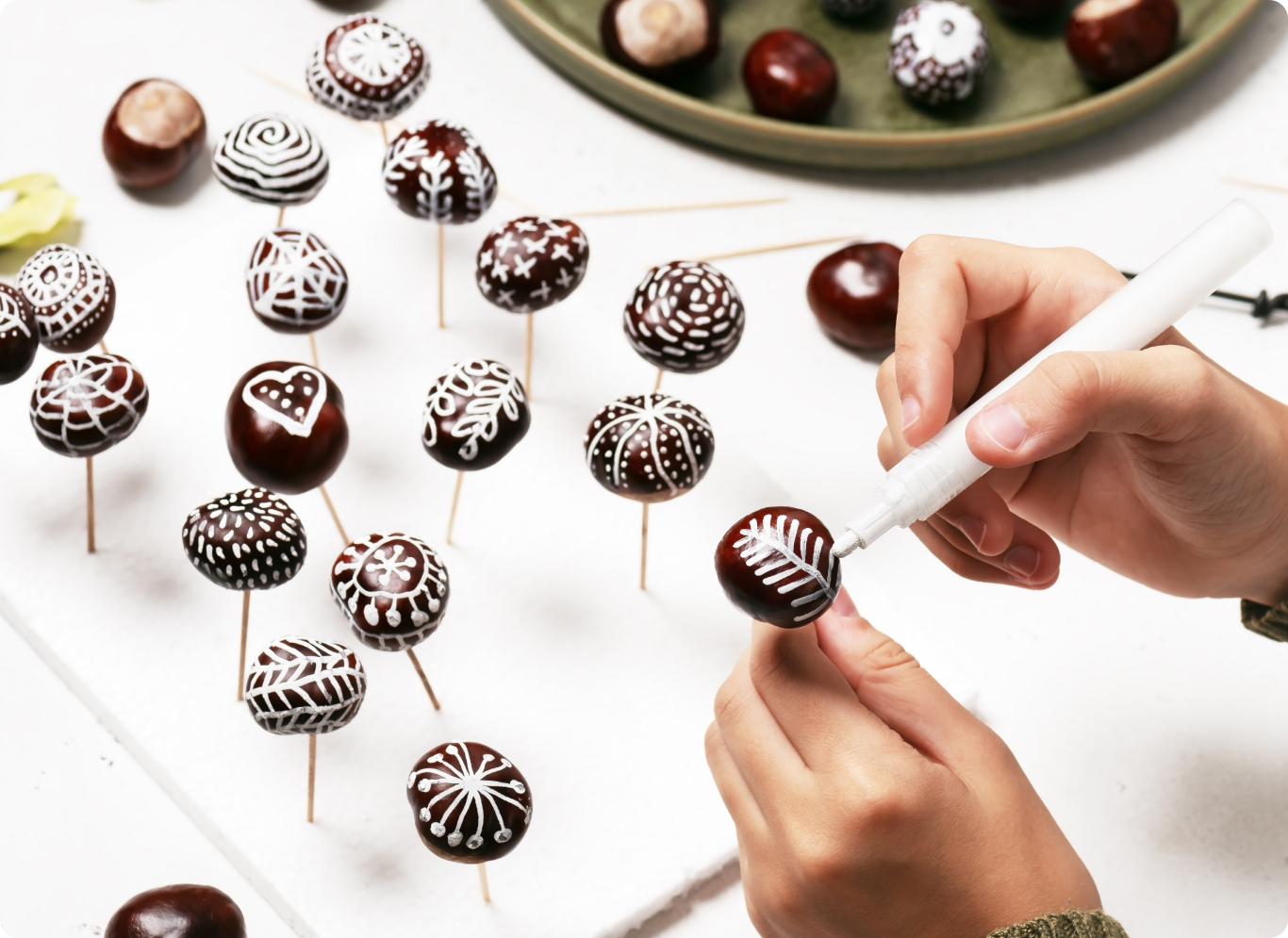 Этот вариант времяпровождения понравится тем, кто обожает красить яйца, но не хочет ждать весны. Оформлять узорами каштаны — осеннее занятие, которое тоже может стать отличной семейной традицией. А сами разрисованные каштаны можно потом положить на стол или на полку в качестве декоративного элемента. Классно, что в такой простой бело-каштановой стилистике, любая детская каляка-маляка будет выглядеть прикольно.
