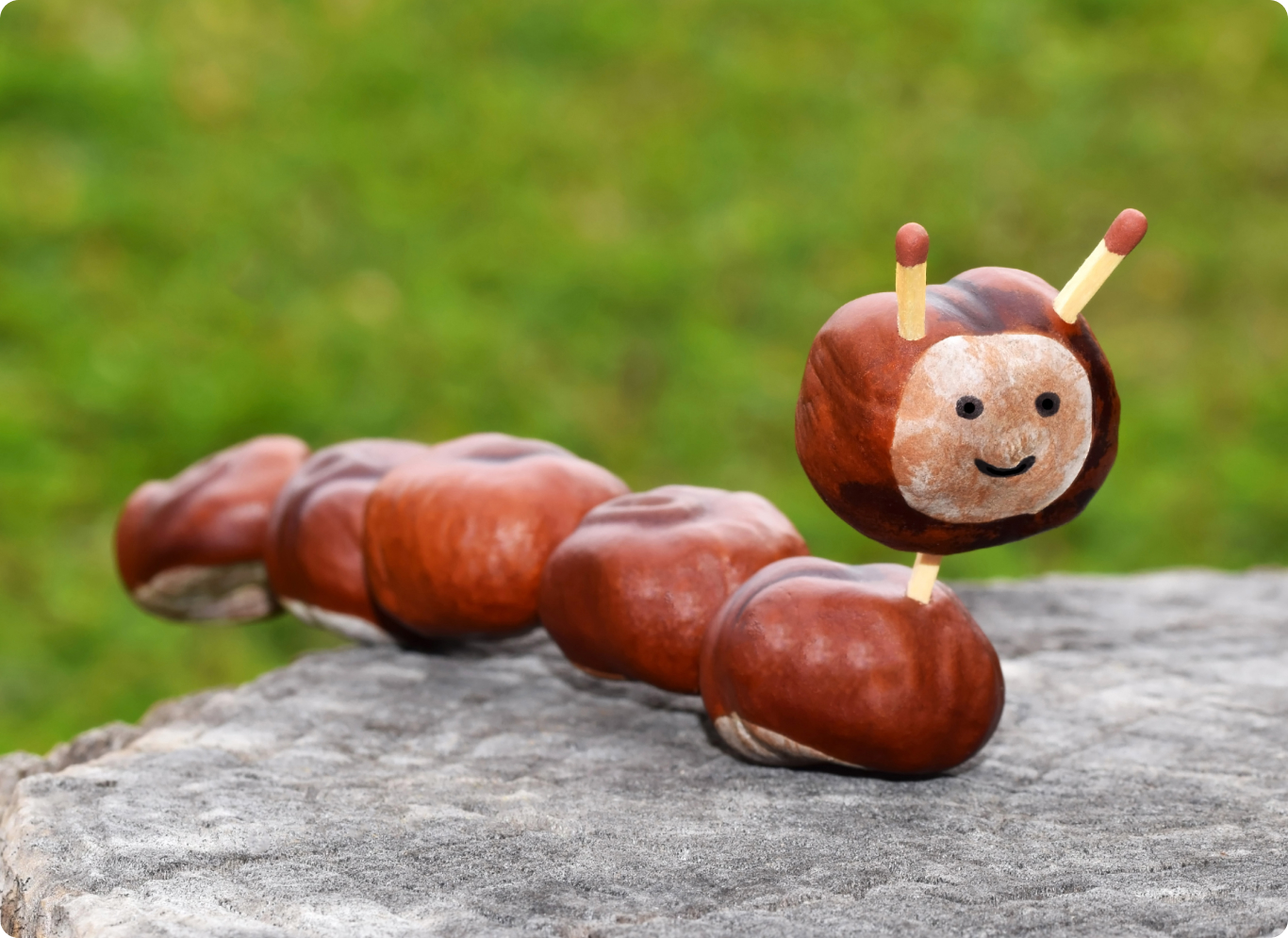 Еще одна простая поделка — гусеница. Соединительным материалом между каштанинами выступает пластилин. Лучше использовать разноцветный. На голову гусенице можно с помощью пластилина приделать еще пару еловых иголок — получатся рожки из природных материалов. А на лицо наклейте все те же выпуклые стикеры с глазами. Голливудскую улыбку этой особе можно подрисовать красным маркером.