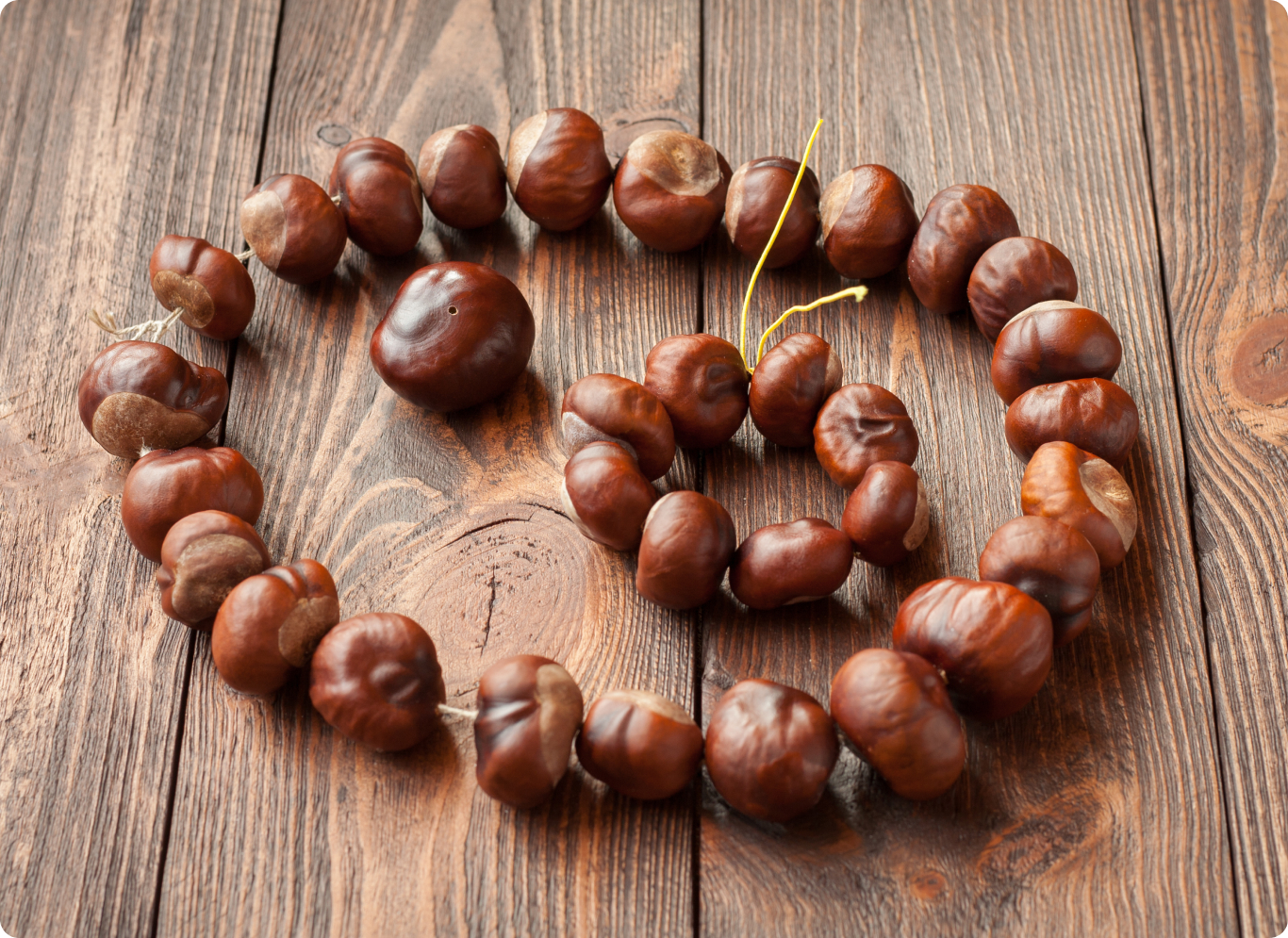 Если на прогулке в парке вы собрали пару десятков каштанов, то можно пустить их в ювелирное производство. Опасную часть работы, правда, лучше доверить взрослому: проделать дырочки в каштанах можно с помощью дрели или шила (или аккуратно вбивая в каштан гвоздик). Когда бусины природного происхождения будут готовы, ребенок сможет уже сам их нанизывать на леску. Опционально можно добавить бусины из другого материала, чтобы сделать украшение поярче (хотя пуристы наверняка предпочтут одни каштанчики). В конце леску на бусах нужно закрепить вместе (особенно, если вам не хочется заморачиваться со всякими застежками).