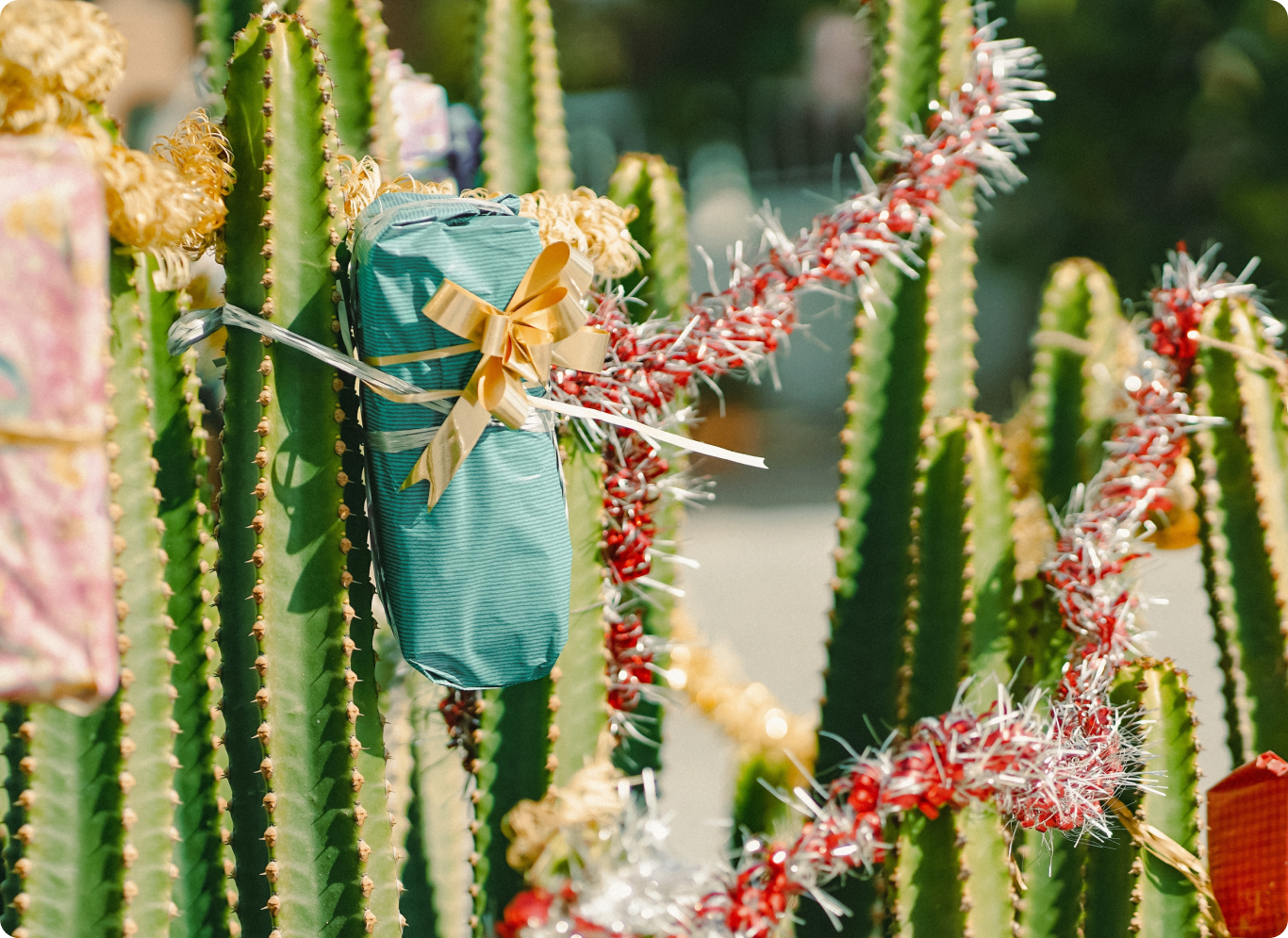 Наряжать к Новому году можно и другие живые растения. У многих дома растут кактусы, которые по высоте почти не уступают елкам. Украшать это праздничное растение нужно осторожнее, зато выглядеть тоже будет красиво. И его не придется выбрасывать или разбирать, как в случае с живыми и искусственными елками.