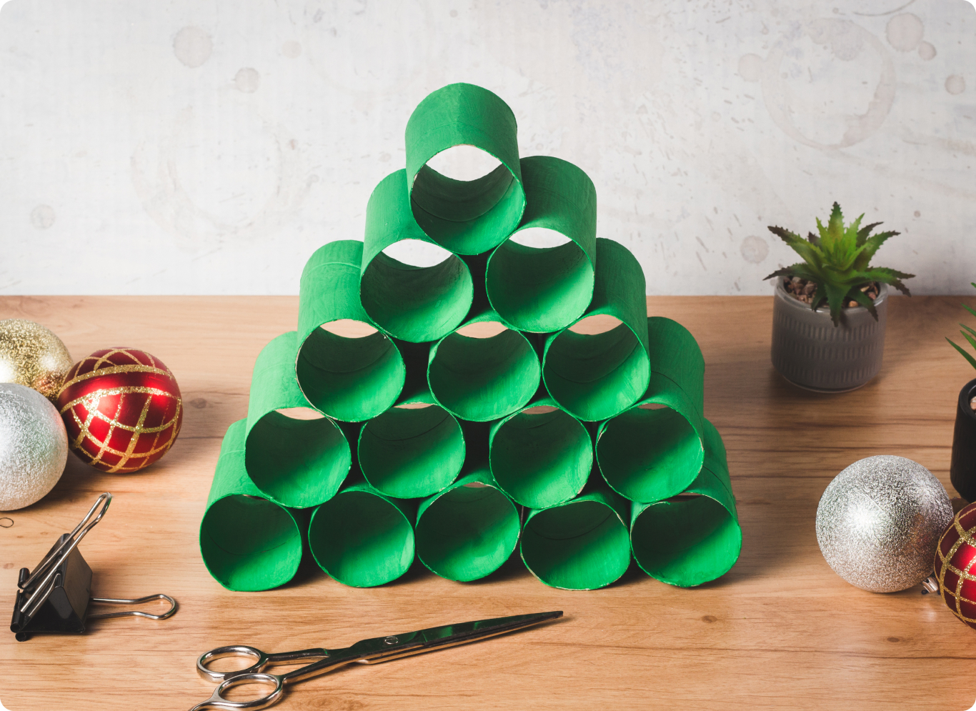 Цилиндры можно купить в строительном магазине или использовать втулки от туалетной бумаги. Покрасьте их в зеленый цвет и закрепите на листе картона или фанеры, чтобы композицию не пришлось разбирать в январе. Украшать эту елку даже проще, чем обычную: кладите игрушки прямо в цилиндры.