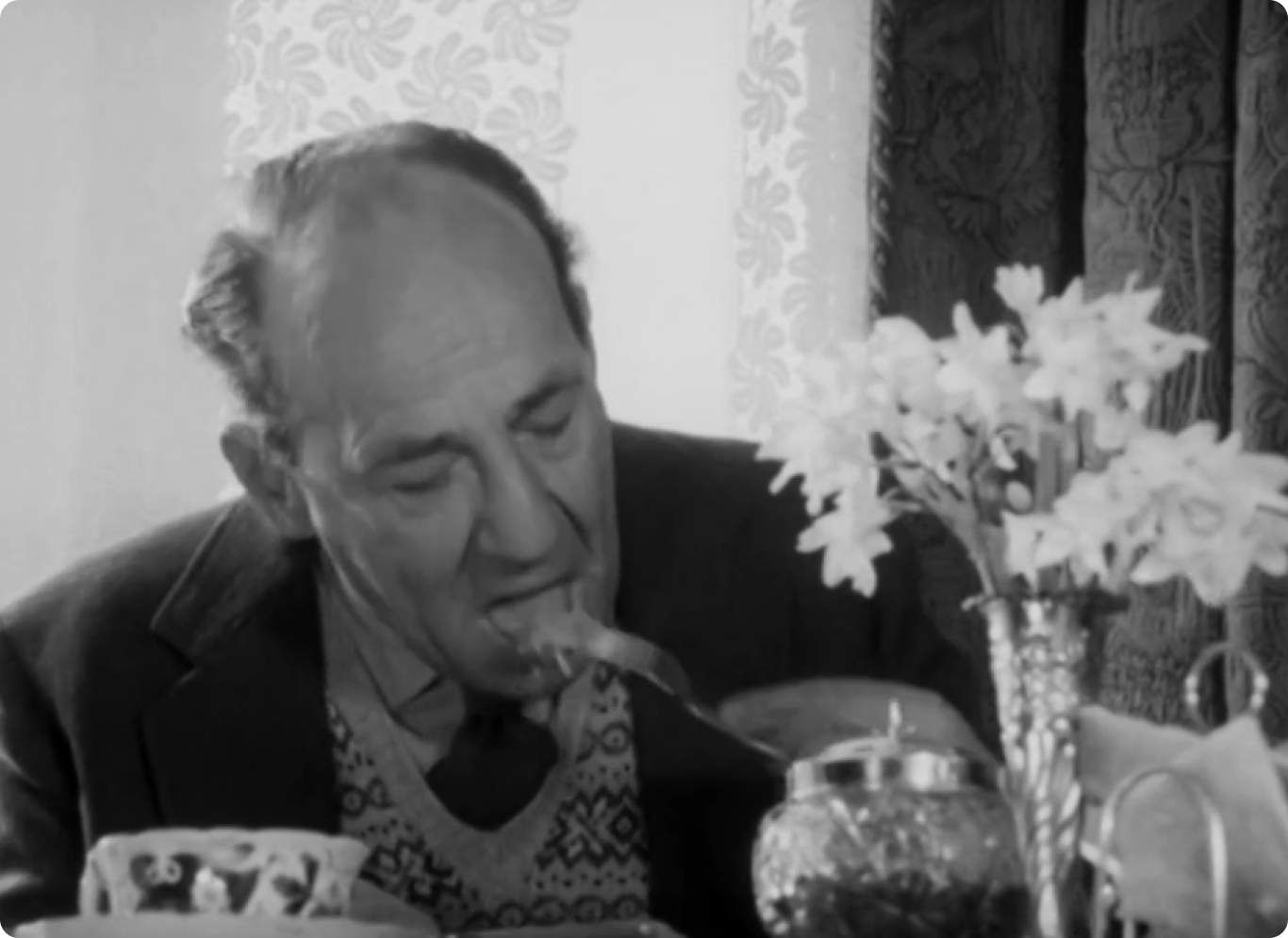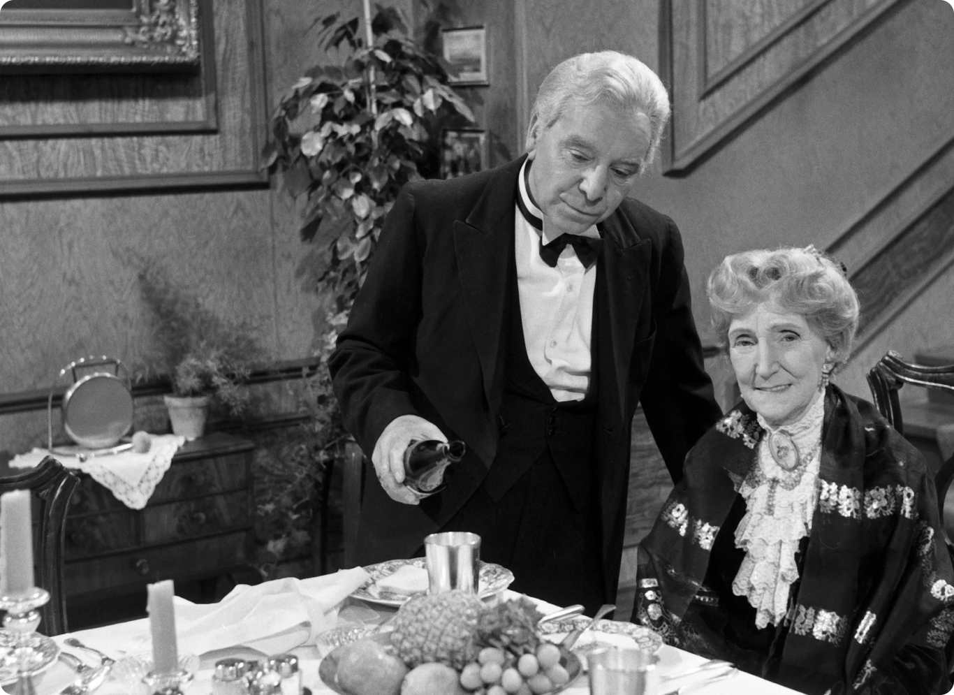 Этот черно-белый скетч был снят в 1962 году в Западной Германии. Интересно, что действие картины происходит не в канун Нового Года и не на Рождество. Юбилей празднует аристократическая дама Мисс Софи, ей исполняется 90 лет.