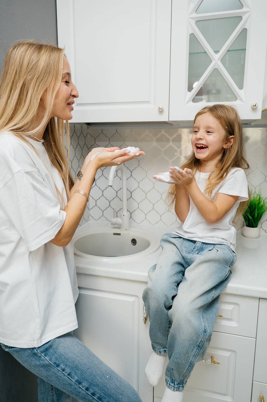 Никаких традиционных скучных средств для посуды! Возьмите не стандартный гель, а специальную пенку с каким-нибудь классным запахом. Как те милые корейские пенки для умывания, только для посуды. Дайте ребенку возможность напенить ее прямо на посуду, а потом уже смыть теплой водой с чистой губкой. Так во-первых, будет гораздо быстрее, а во-вторых, по нашему опыту, такой способ мытья посуды почему-то вызывает у детей гораздо меньше сопротивления.
