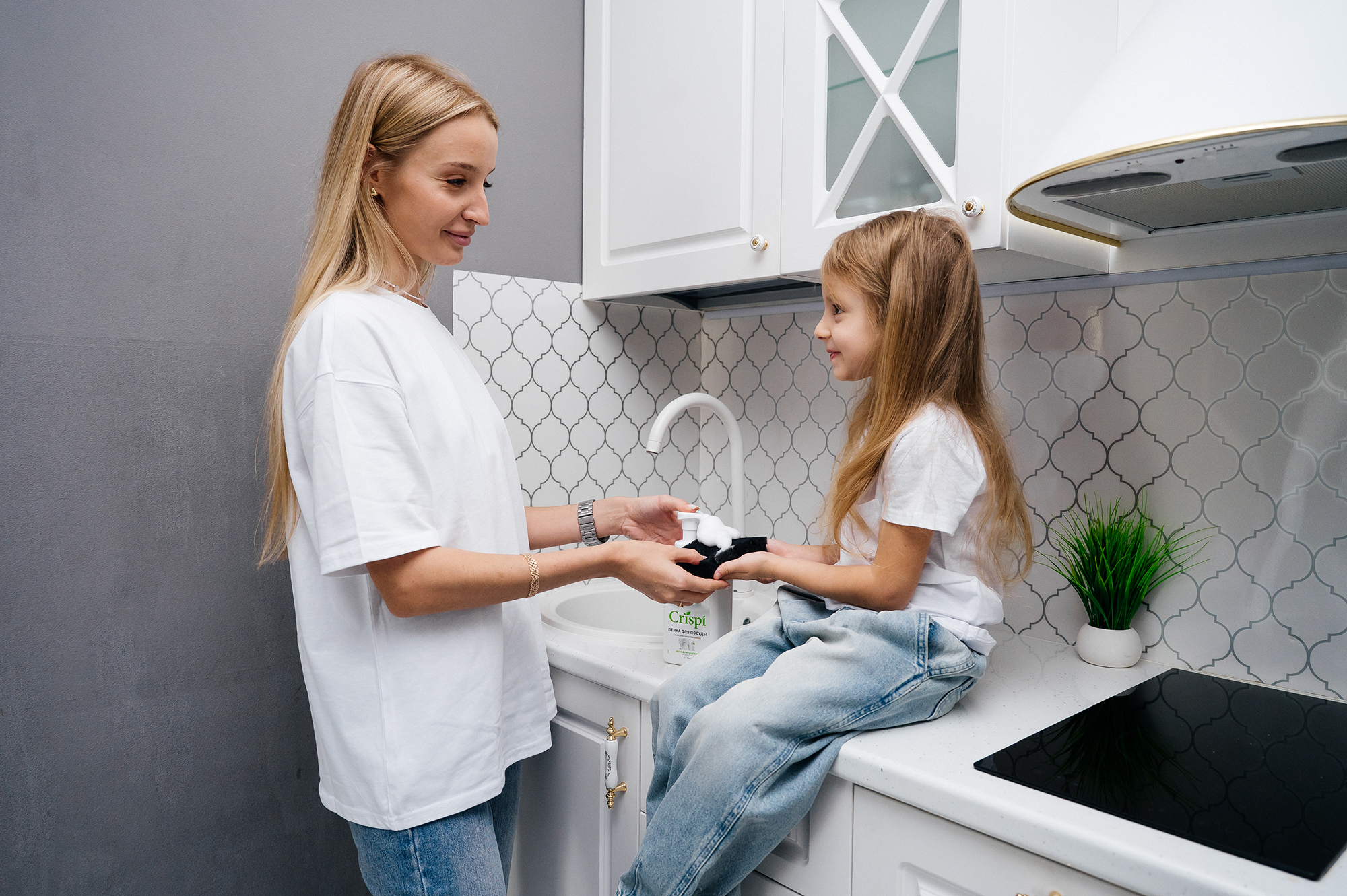 Пенка для посуды Crispi отлично подойдет для такой затеи. Это не обычный гель, который нужно взбивать губкой, а нежная пена, которая появляется прямо из бутылочки со средством. Ее приятно трогать, можно набирать в руки или рисовать пенные узоры на тарелках. А еще она чудесно пахнет!