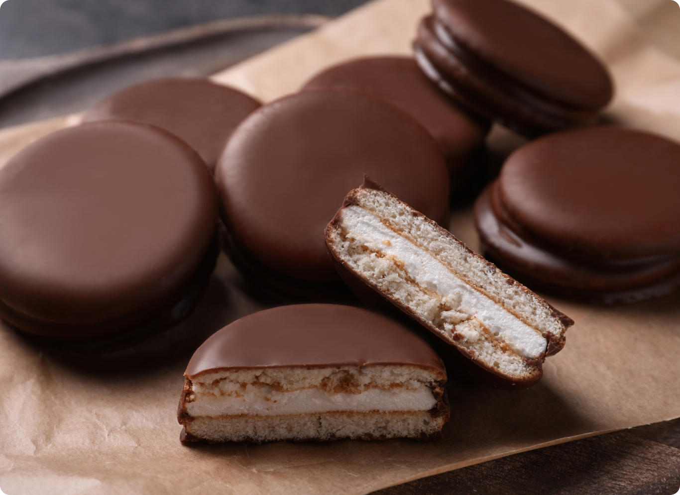 Вырежьте из бисквита кружочки. Соедините по два кружочка с помощью маршмеллоу. Полейте каждое пирожное шоколадом, разровняйте его ложкой или лопаткой. Уберите пирожные в холодильник на 15 минут.
