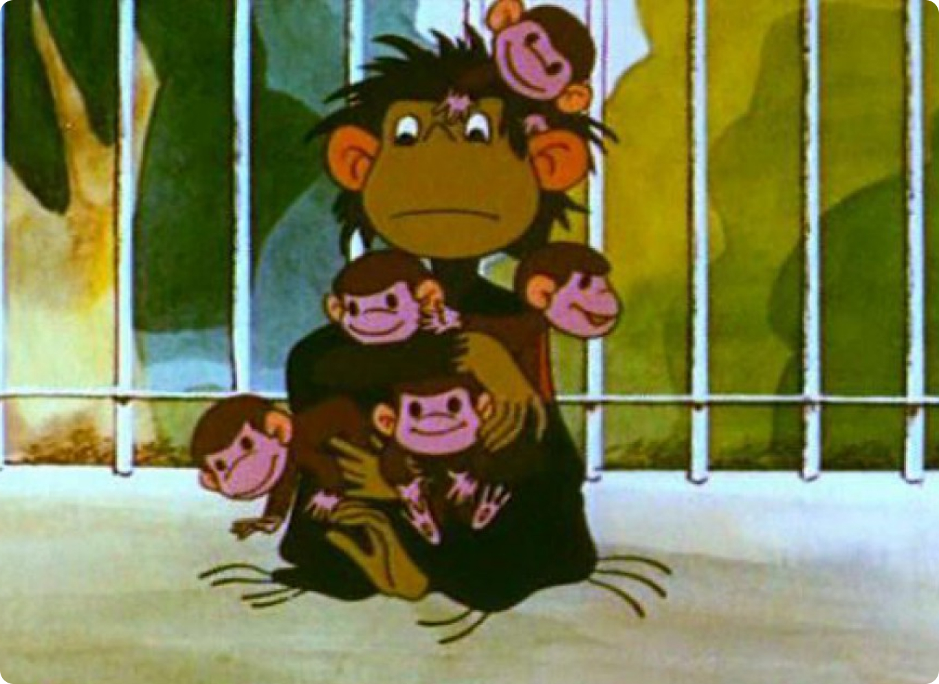 Сага об обезянках и их героической матери — это даже не отдельный мультик, а целый сериал по сценарию Григория Остера. У мамы обезьяны пятеро детей, один из них совсем маленький. Детям сегодня наверняка бы диагностировали гиперактивность, и мама на протяжении всех серий пытается хоть как-то за ними угнаться.
