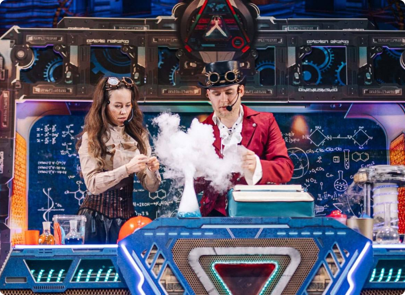 Юных любителей науки ждут светящиеся декорации, оригинальные костюмы и энергия гигантских двигателей, а еще профессор Биопанк проведет пятнадцать невероятных экспериментов, основанных на электричестве и природных явлениях.