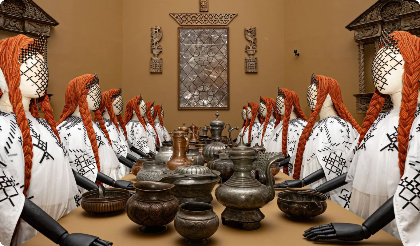 Экспозиция выстроена по законам сна: здесь легко встретить волшебных царевен, птицеподобных дев, былинных героинь и женские образы, сливающиеся с природными стихиями. Выставочное пространство собрано из предметов декоративно-прикладного искусства: резных наличников, кованых сундуков, изразцов, старинных инструментов, кокошников и металлической утвари. Все это не музейная реконструкция, а живая среда, где прошлое спокойно сосуществует с авторской фантазией.