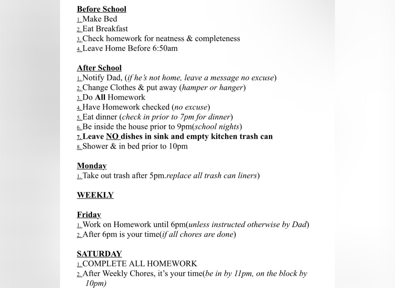 Отец мужчины подробно расписал все задания, в том числе то, что он должен сделать до школы, после школы и в какие дни недели. Как только ребенок просыпался, он должен был заправить кровать.
