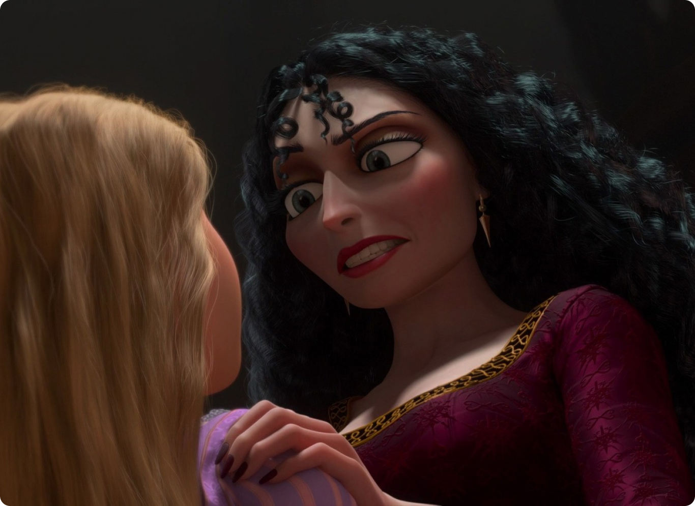 Тема деспотичных родителей достаточно табуирована в обществе. Родитель может быть строгим (Тритон из «Русалочки», Туи из «Моаны», Элинор из «Храброй сердцем»), но жестокость допустимо проявлять лишь неродным — мачехам. Матушка Готель в свое время похитила златовласку Рапунцель с корыстной целью и удерживает ее путем совершенно безжалостных манипуляций. После вокальной партии «Мама умней!» девушке хочется выдать охранный ордер и абонемент к психотерапевту годика так на полтора, ибо без серьезных проблем для психики подобные выступления не проходят.
