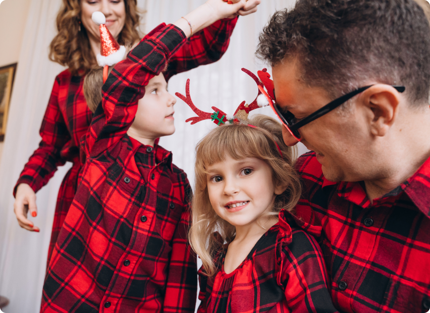 Это первое, что приходит на ум, когда заходит речь о семейной фотосессии — нарядить всех участников в одинаковые пижамы, свитера или шапочки Санта-Клауса. Осталось определиться с тем, каким вы себе представляете ваш идеальный фэмили-лук, и запечатлеть его в студии или дома. Если идея одинаковых нарядов вам не очень нравится, то вы можете просто выбрать один «семейный» цвет или паттерн.