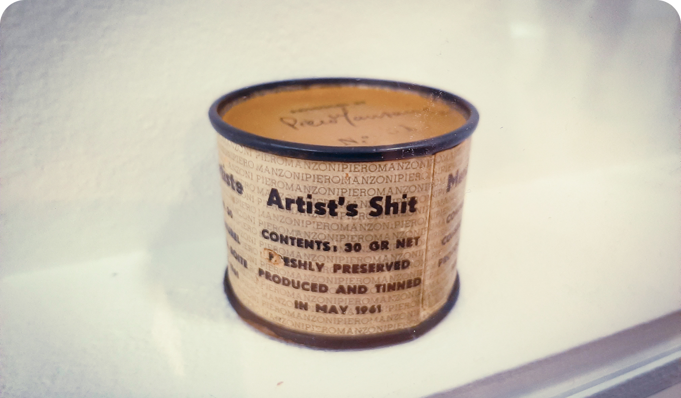 В 1961 году итальянский художник Пьеро Мандзони создал необычные произведения искусства. Он заявил, что собрал свои собственные фекалии, расфасовал их в 90 баночек и написал на каждой: «100% натуральное дерьмо художника».