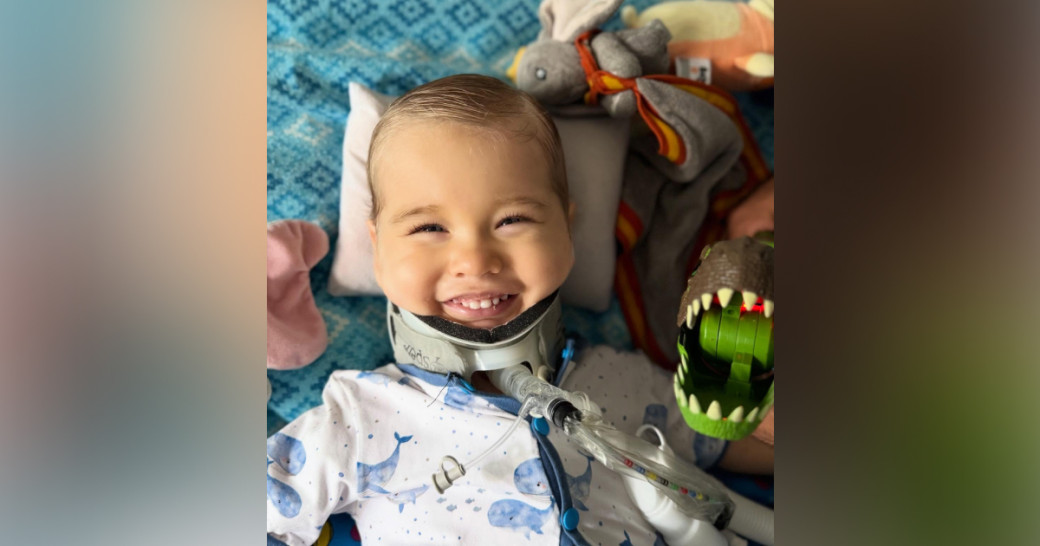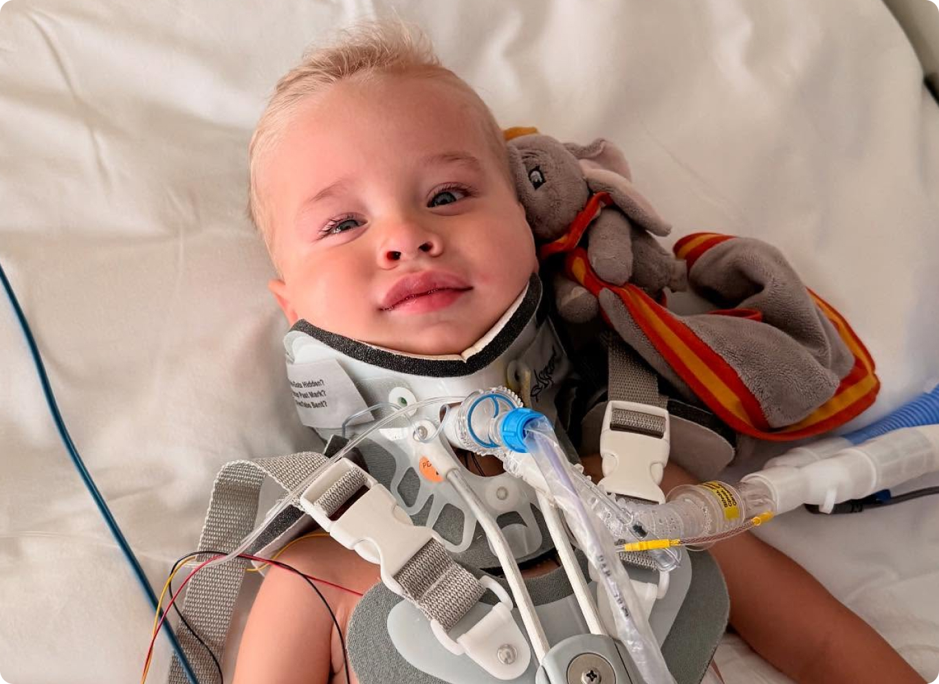 Его травма считалась несовместимой с жизнью, но сейчас ребенок способен разговаривать, двигать руками и ногами и посылать воздушные поцелуи.